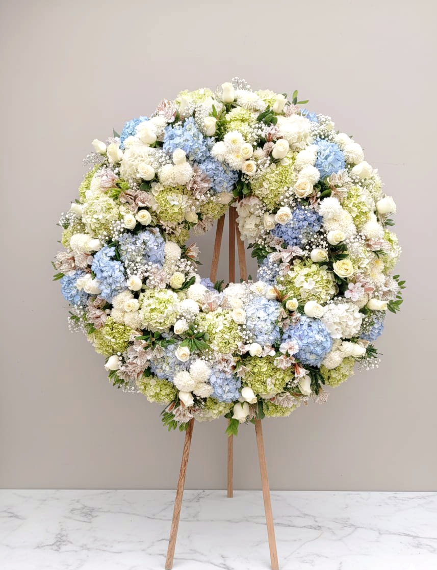 Su diseño circular simboliza la continuidad del recuerdo y el amor eterno. Elaborada con hortensias, rosas blancas y flores de relleno premium, esta corona ofrece una presentación sobria y elegante, ideal para expresar condolencias con sensibilidad y buen gusto.