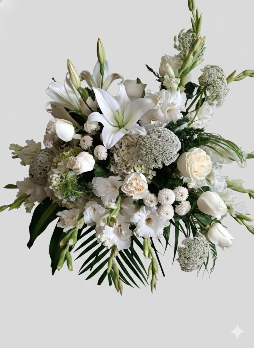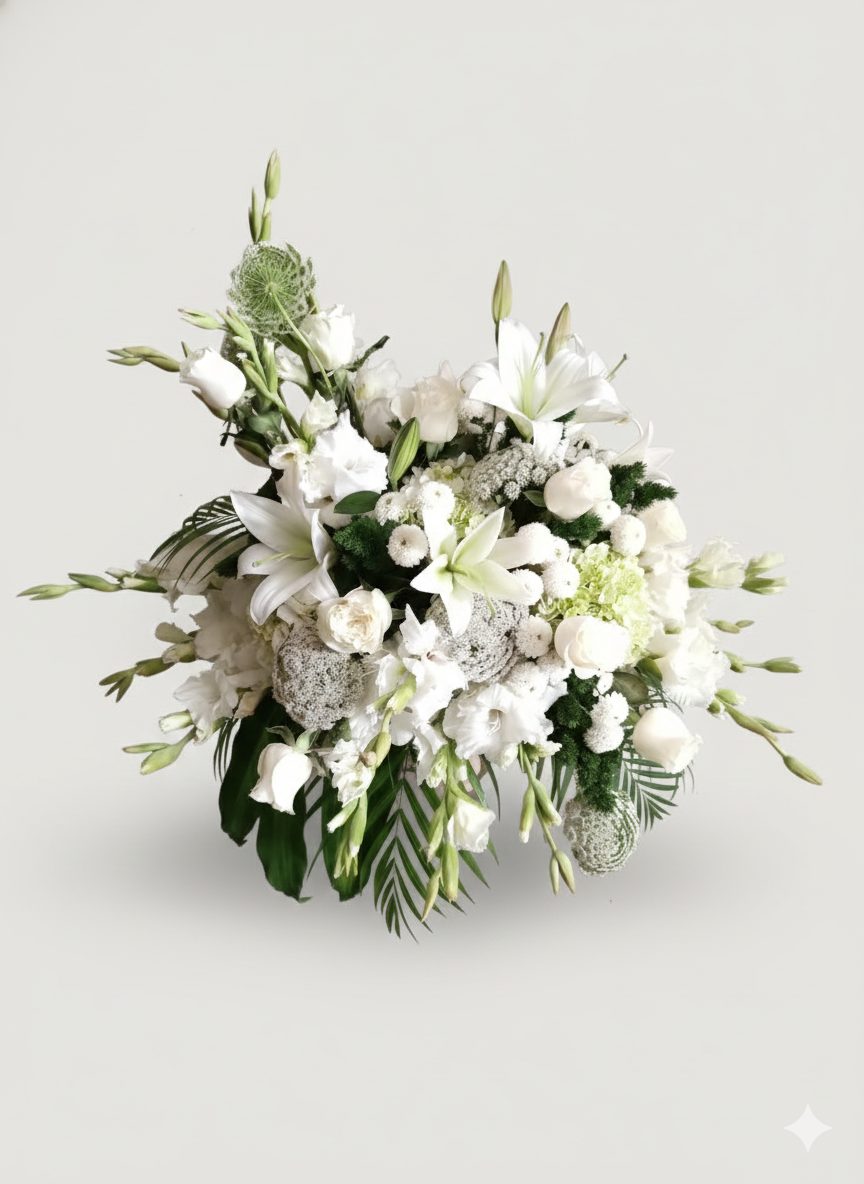 Compuesto por lirios, rosas blancas, flores de estación y follaje natural, su diseño vertical resalta por su armonía y presencia sobria, ideal para velorios, funerales y homenajes póstumos.